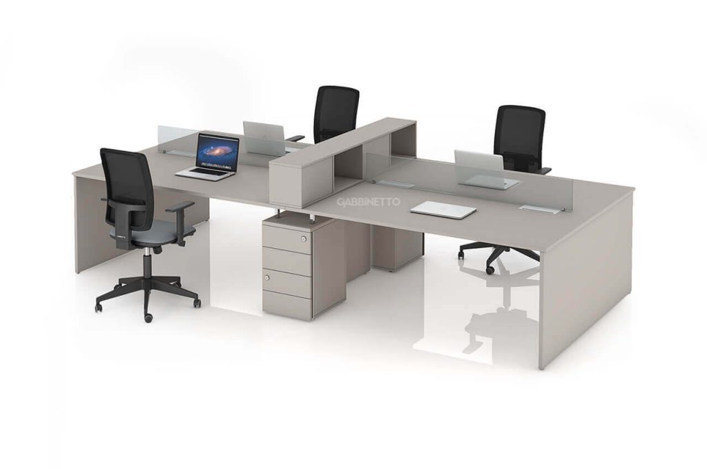 A integração com gaveteiros e divisores de painel permite que o espaço seja aproveitado com inteligência. Cada estação pode contar com espaços individuais de armazenamento e painéis de separação em vidro, tecido, madeira ou lã de PET.