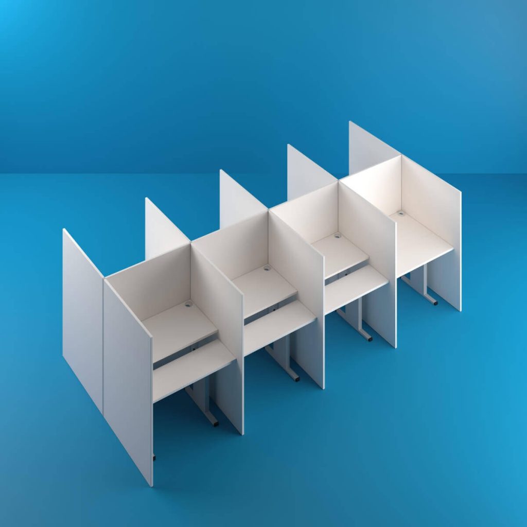 Mesas para Call Center, por exemplo, devem contar com passagem para cabos, divisórias adequadas e dimensões pensadas para facilitar o fluxo de trabalho. Um posto de atendimento desorganizado afeta a produtividade e a percepção do cliente final.