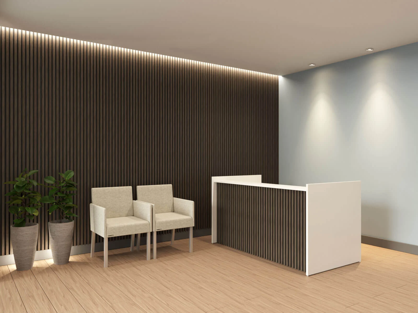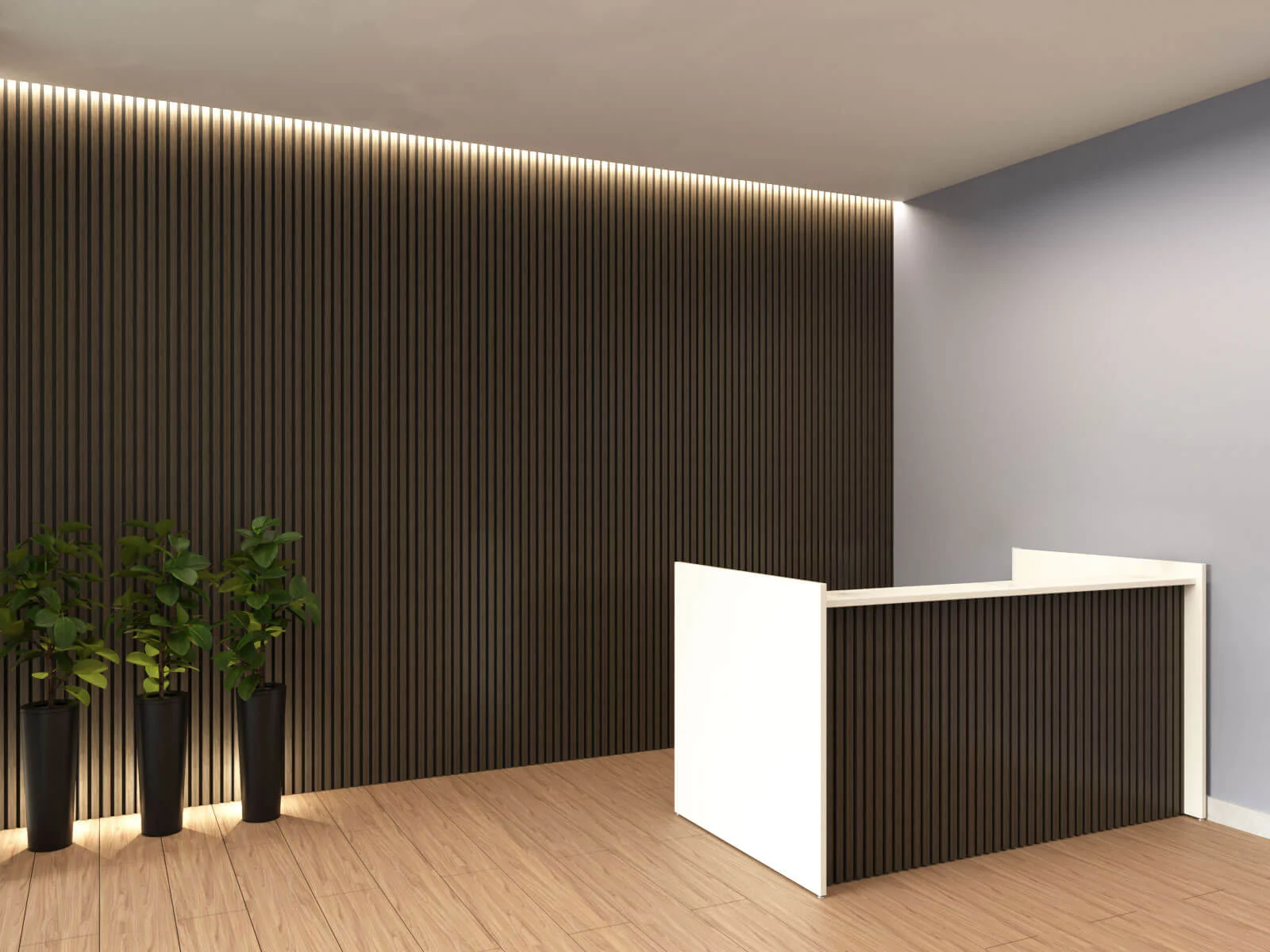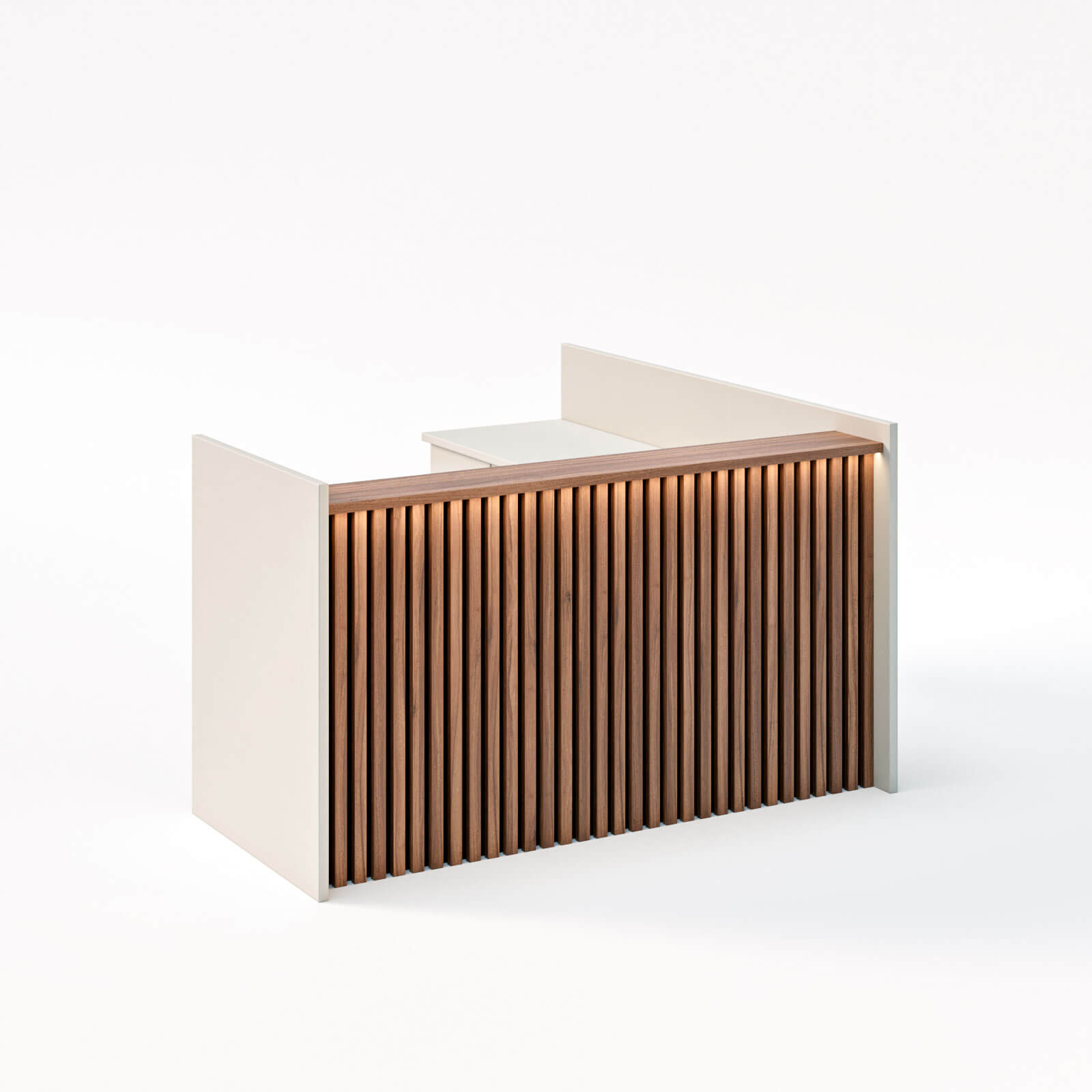 O balcão permite a aplicação de painel ripado frontal, com ripas horizontais ou verticais. Sua funcionalidade pode ser ampliada com a adição de armários ou gavetas, atendendo às necessidades de armazenamento e organização.