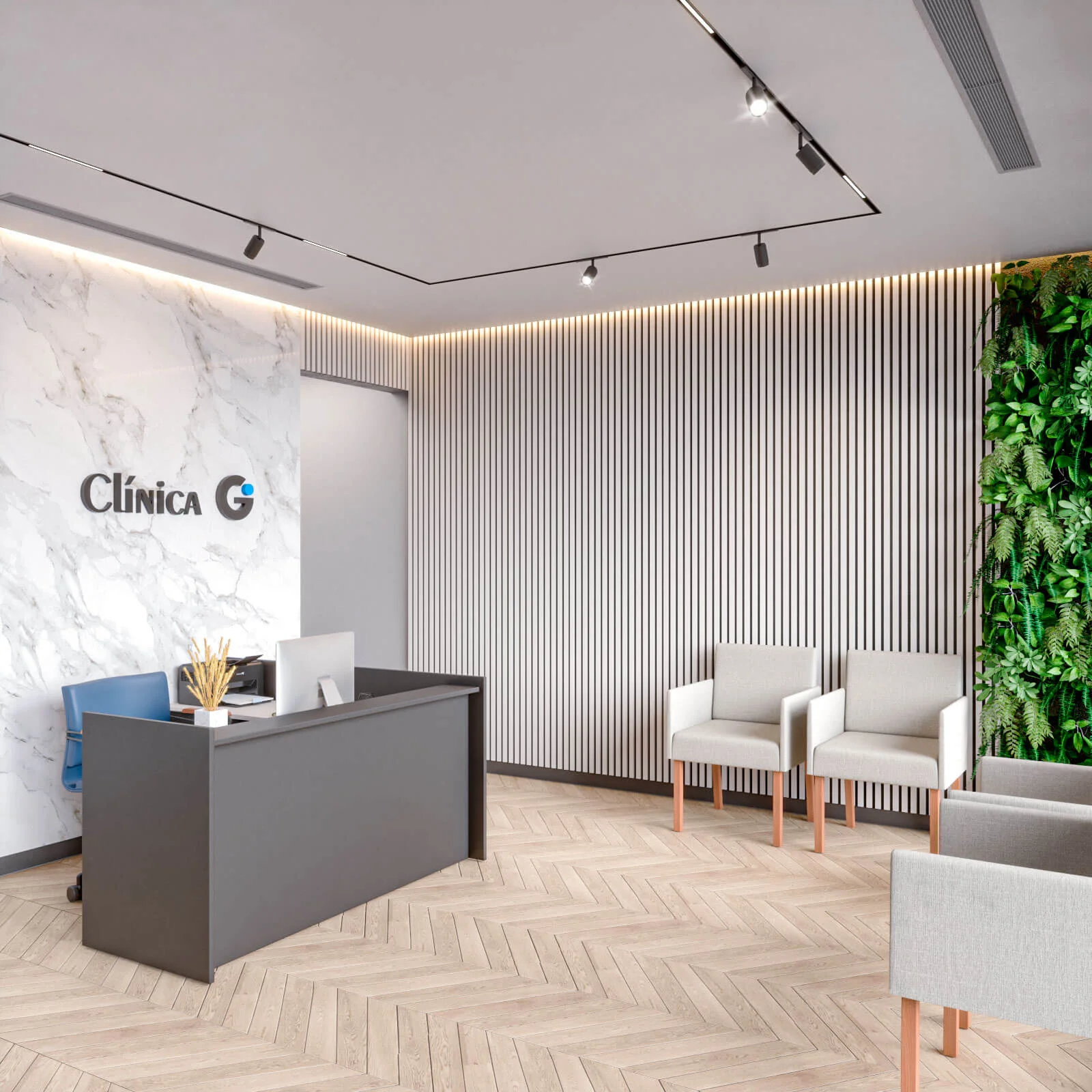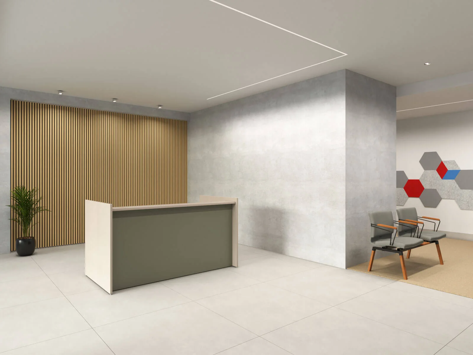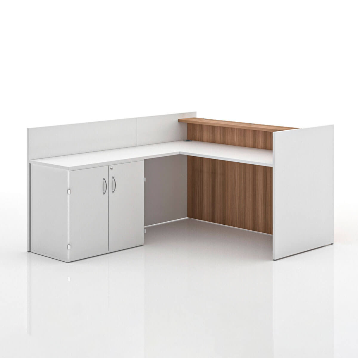 Balcão de atendimento com estrutura em MDP. Oferece superfície espaçosa, projetado para receber clientes com elegância e eficiência.