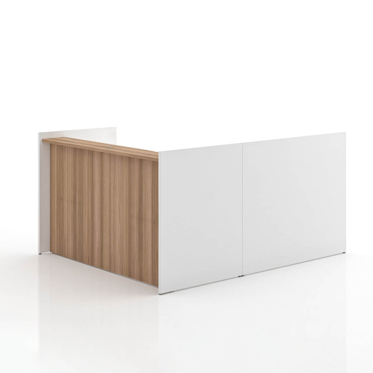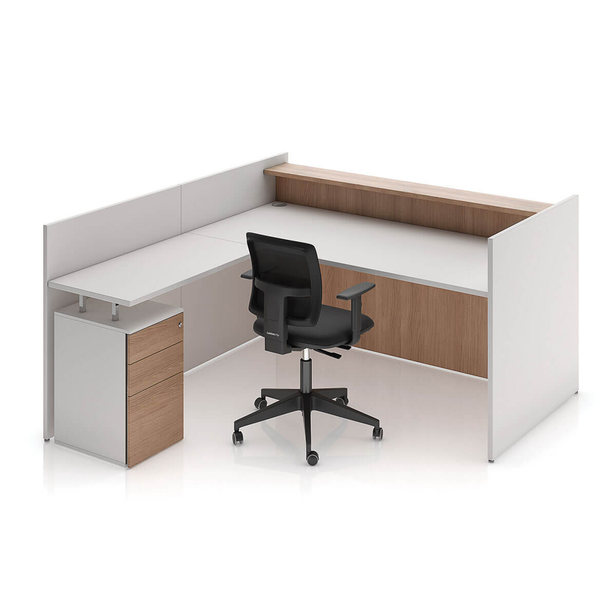 | Opcionais: | Armário baixo, gaveteiro volante ou pedestal, biombo lateral estendido, painel ripado. |