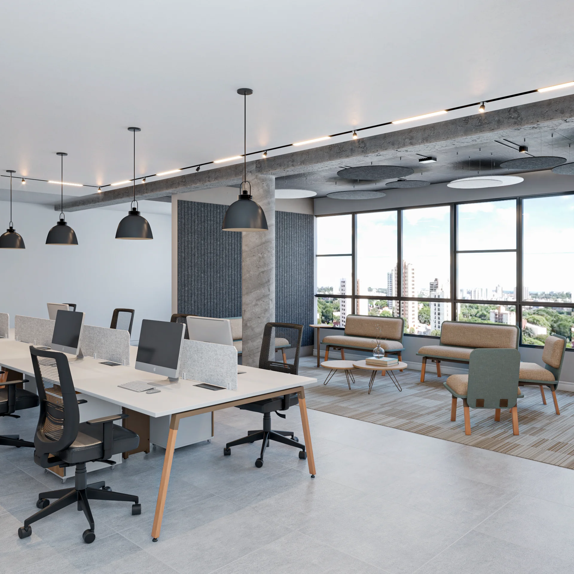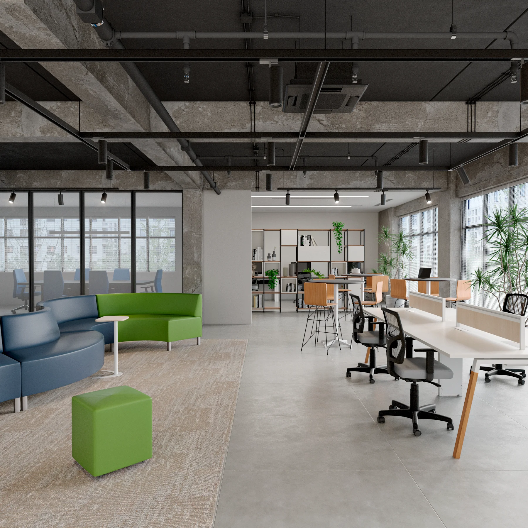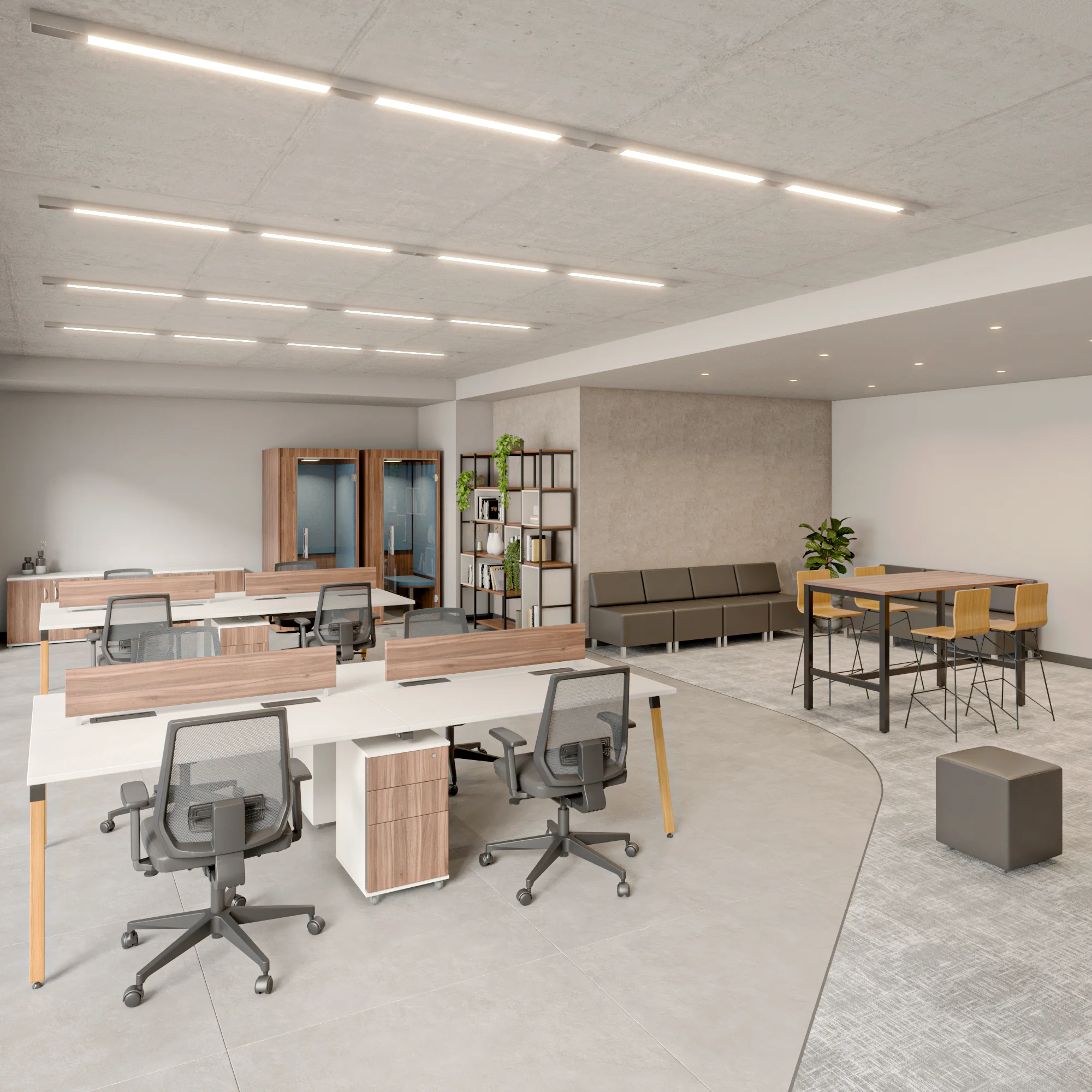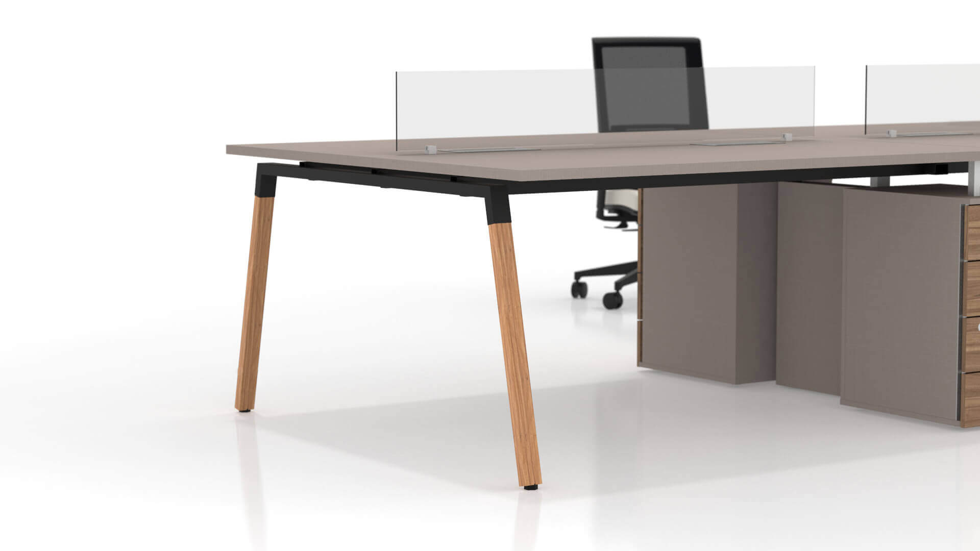 Apresenta estrutura metálica e pés em madeira de eucalipto tratada, com linhas retas que contrastam com o ar mais rústico. Dispõe de soluções inteligentes para organização de cabos e caixas de conectividades com entradas elétricas e de dados. Além disso, oferece a possibilidade de integrar gaveteiros para otimizar o espaço de armazenamento.