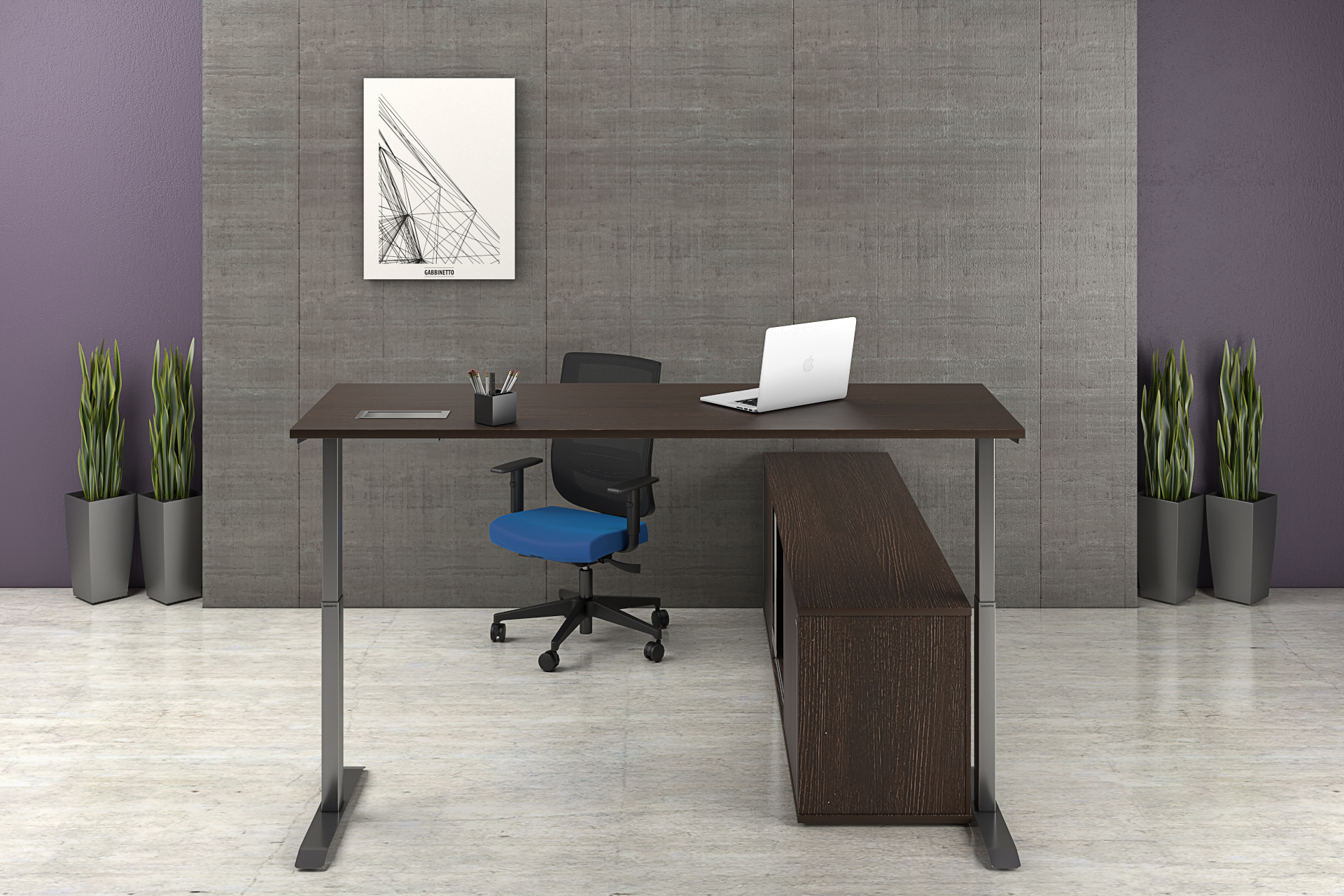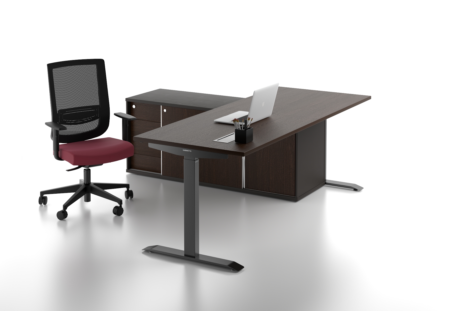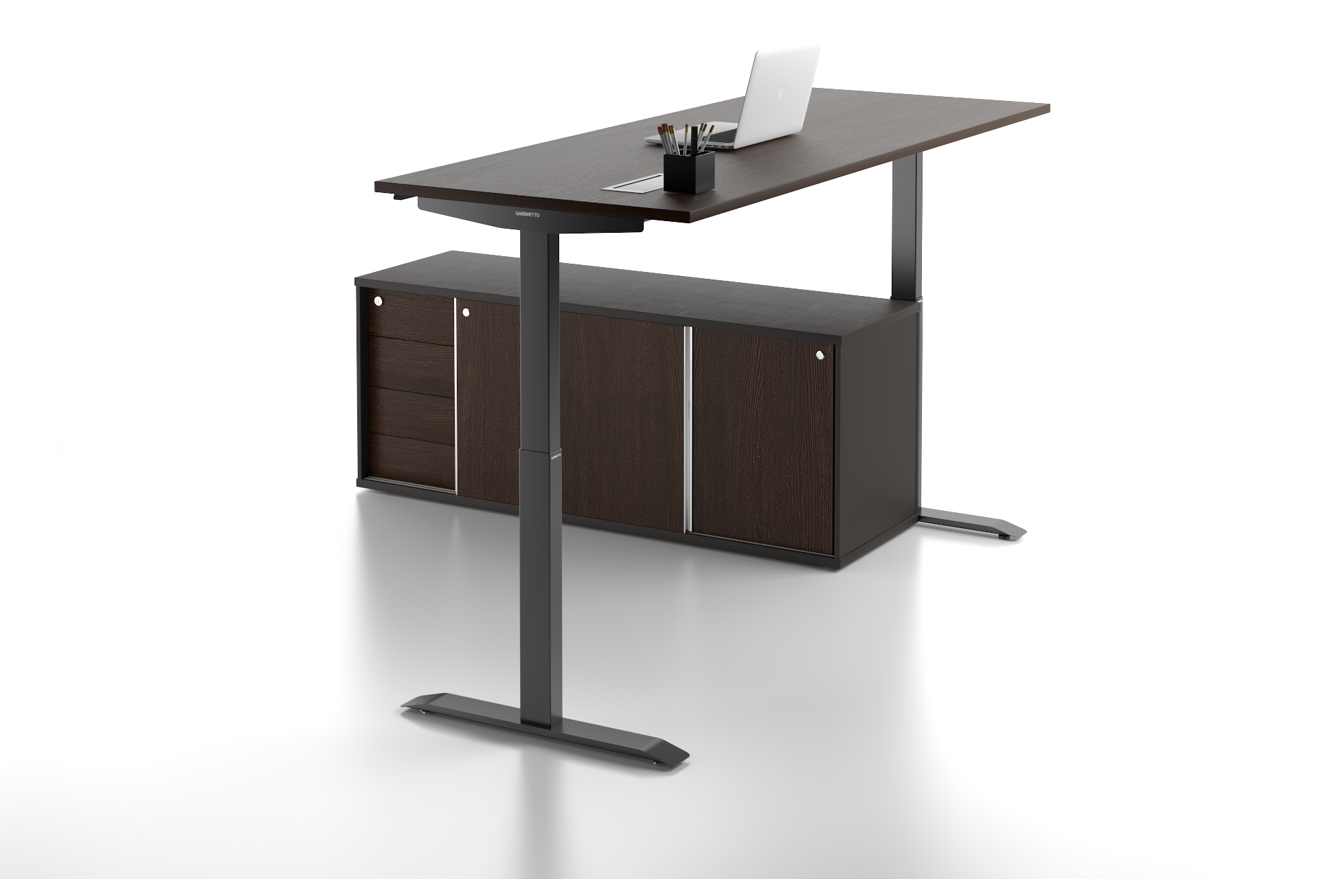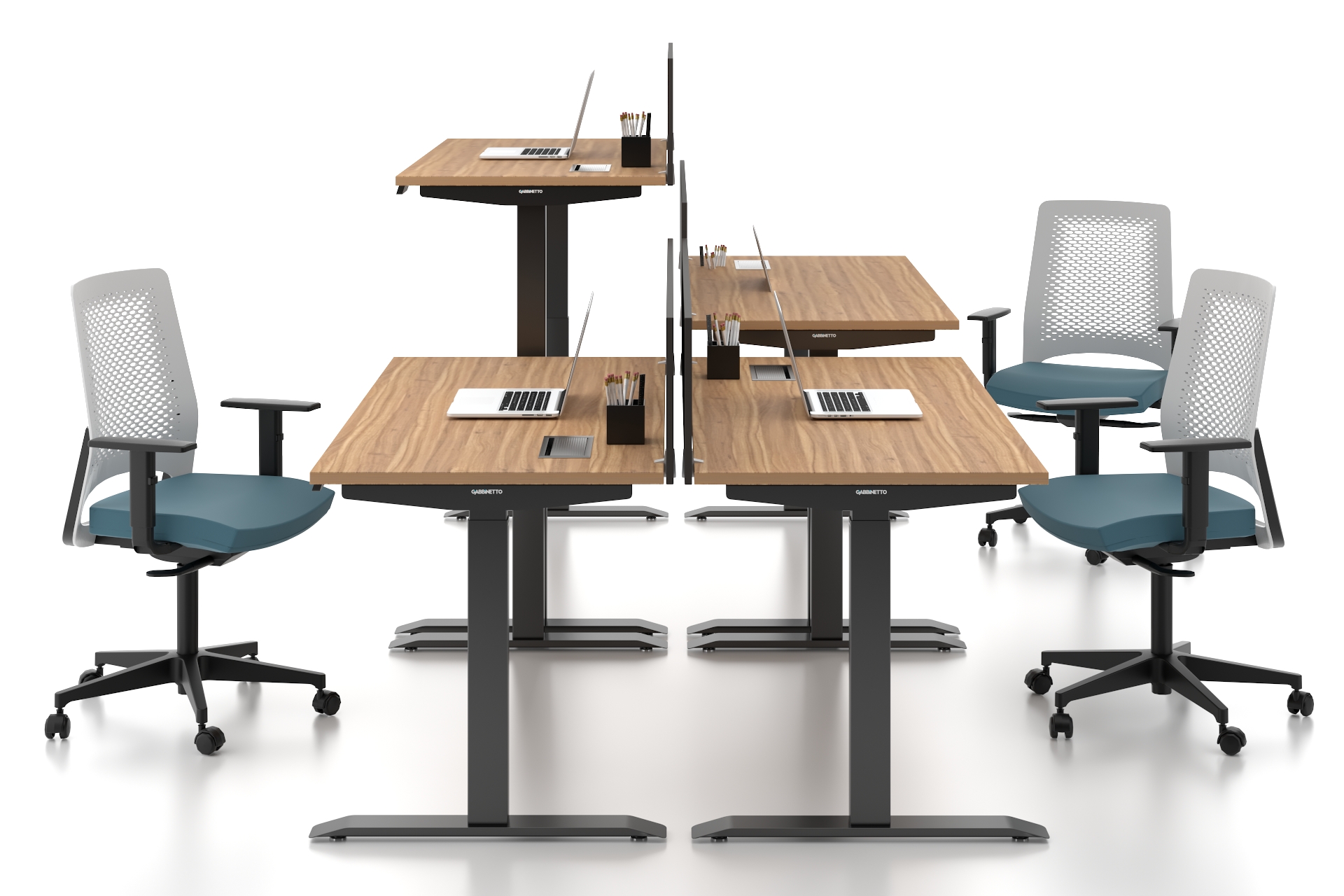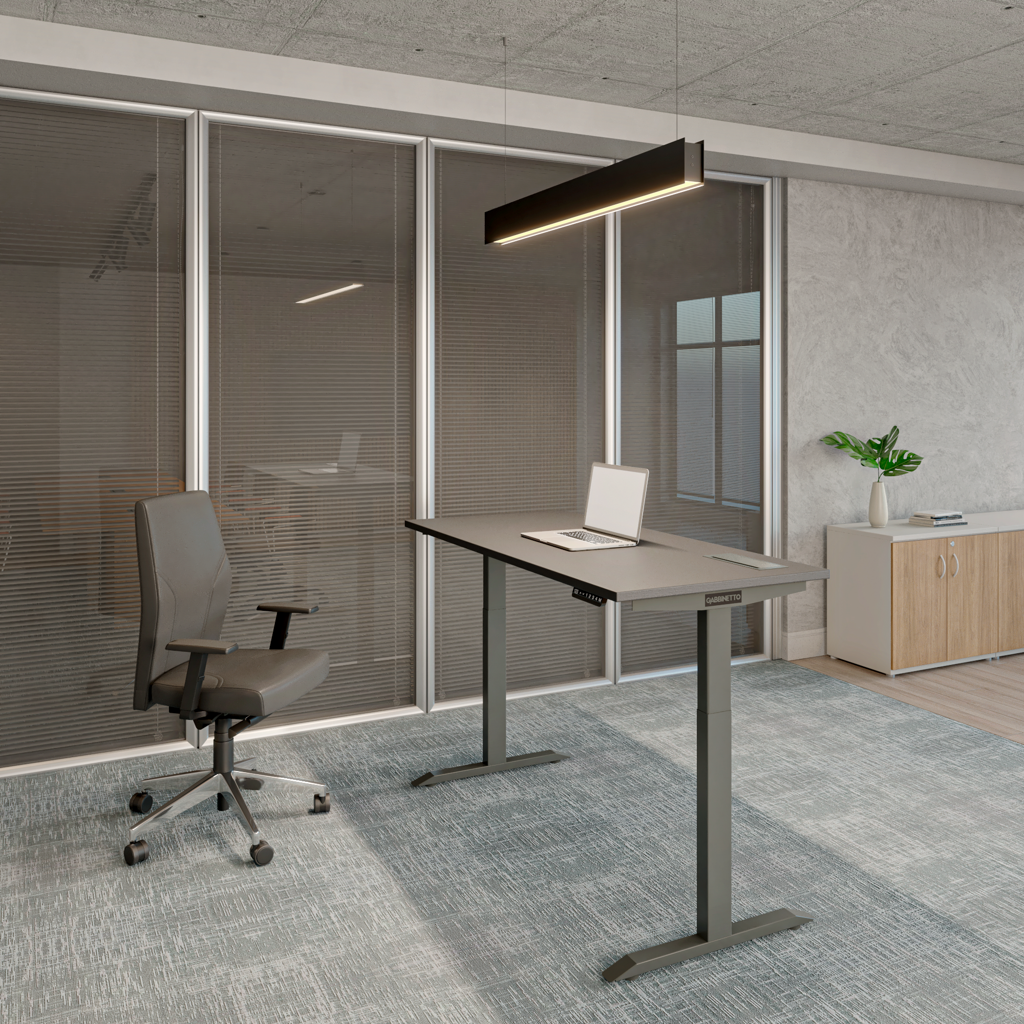 A mesa SD da Gabbinetto foi projetada para revolucionar seu modo de trabalho. Com regulagem elétrica de altura e 3 memórias programáveis, ela permite alternar facilmente entre trabalhar sentado ou em pé, garantindo mais conforto e naturalidade no seu dia a dia.